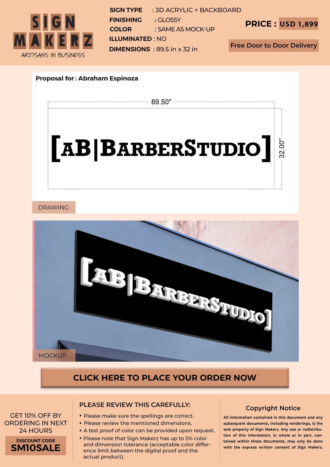 3d acrylic sign with backboard (Non-Lit) for Abraham Espinoza