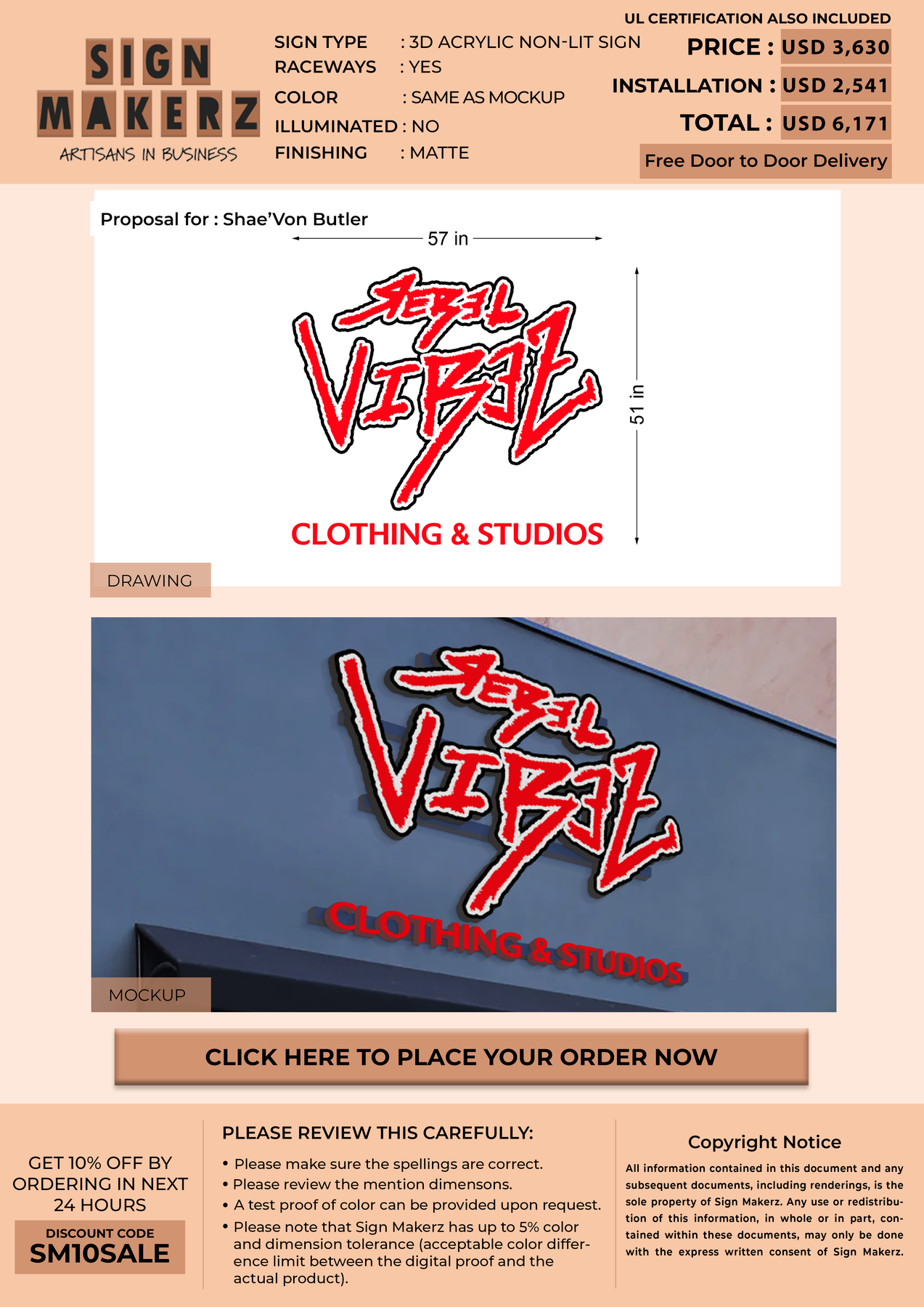 3d UV acrylic non-lit sign with raceways for Shae’Von Butler