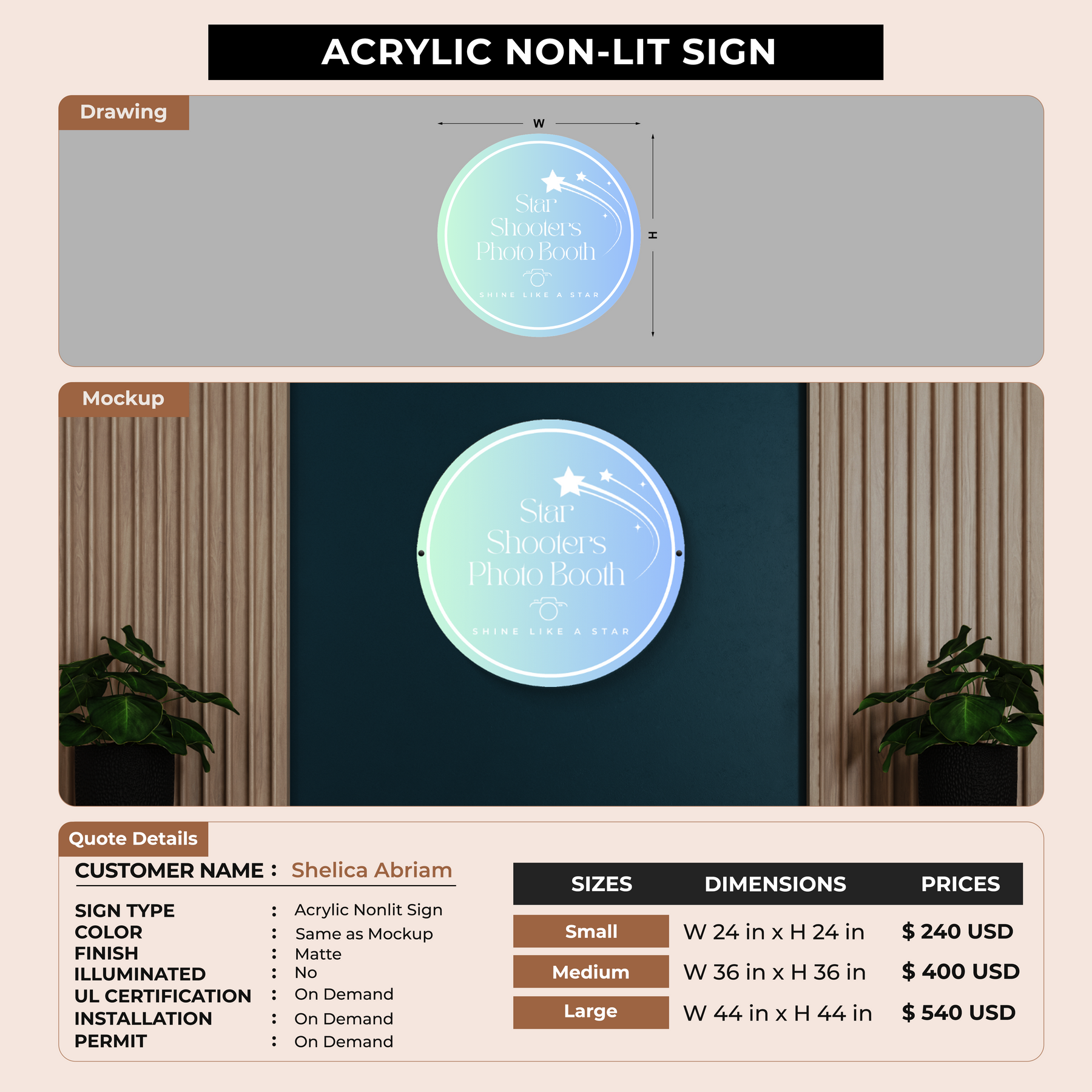 Acrylic non-lit sign for Shelica Abriam