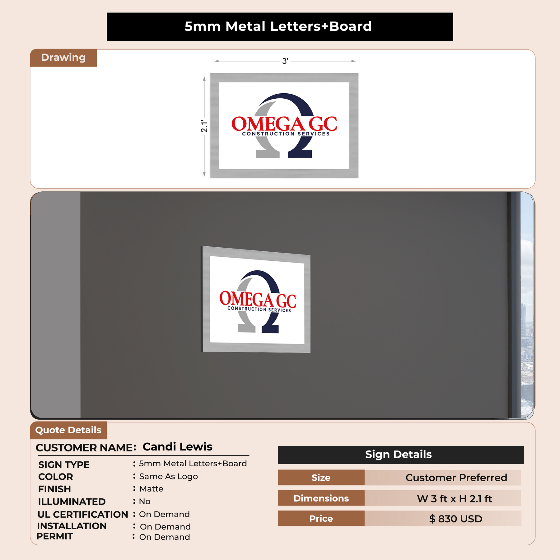5mm metal sign with board for Candi Lewis Candi