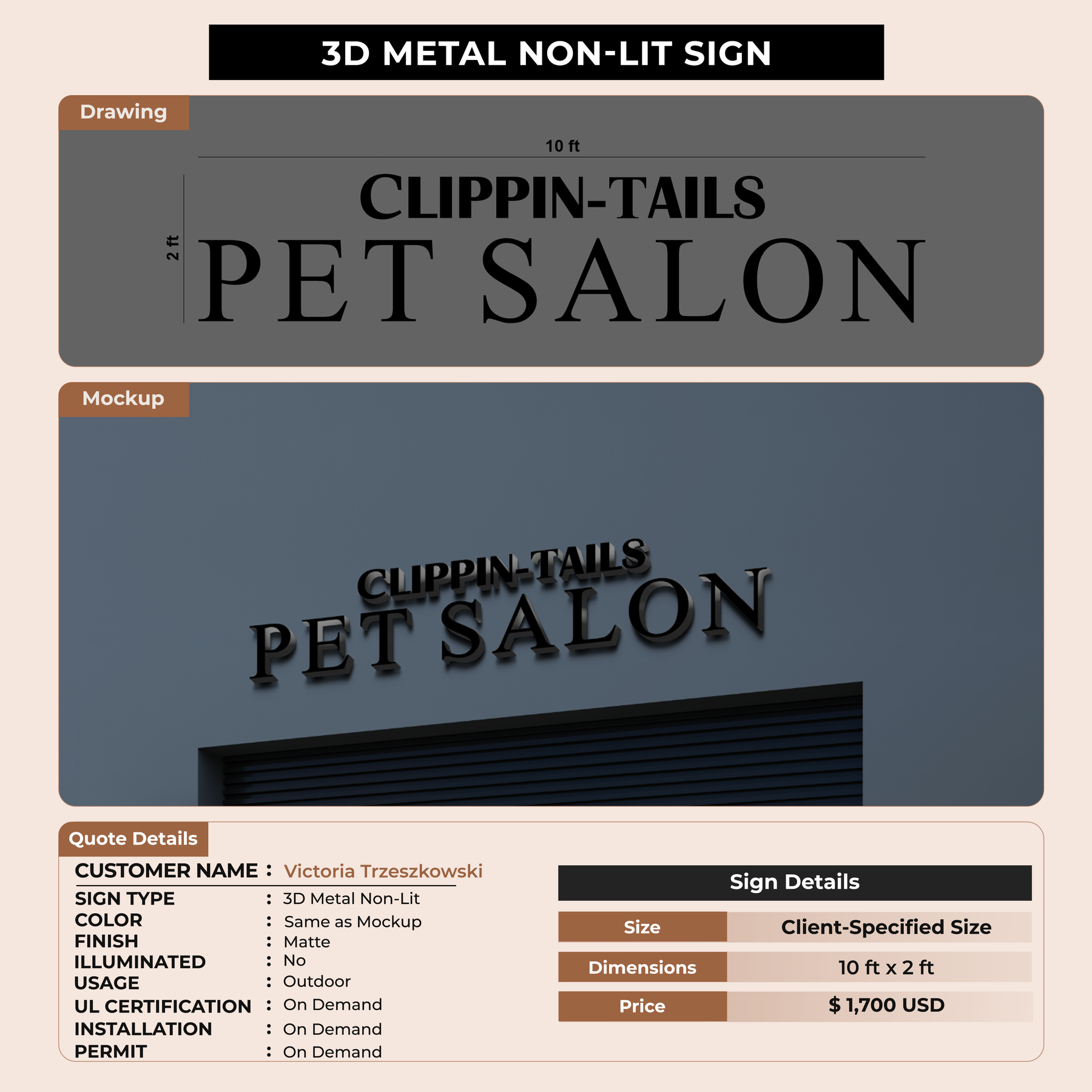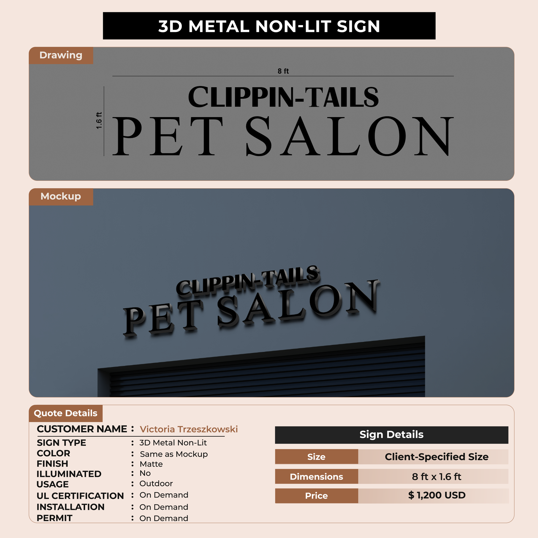 3D Metal Non-lit sign for Victoria Trzeszkowski