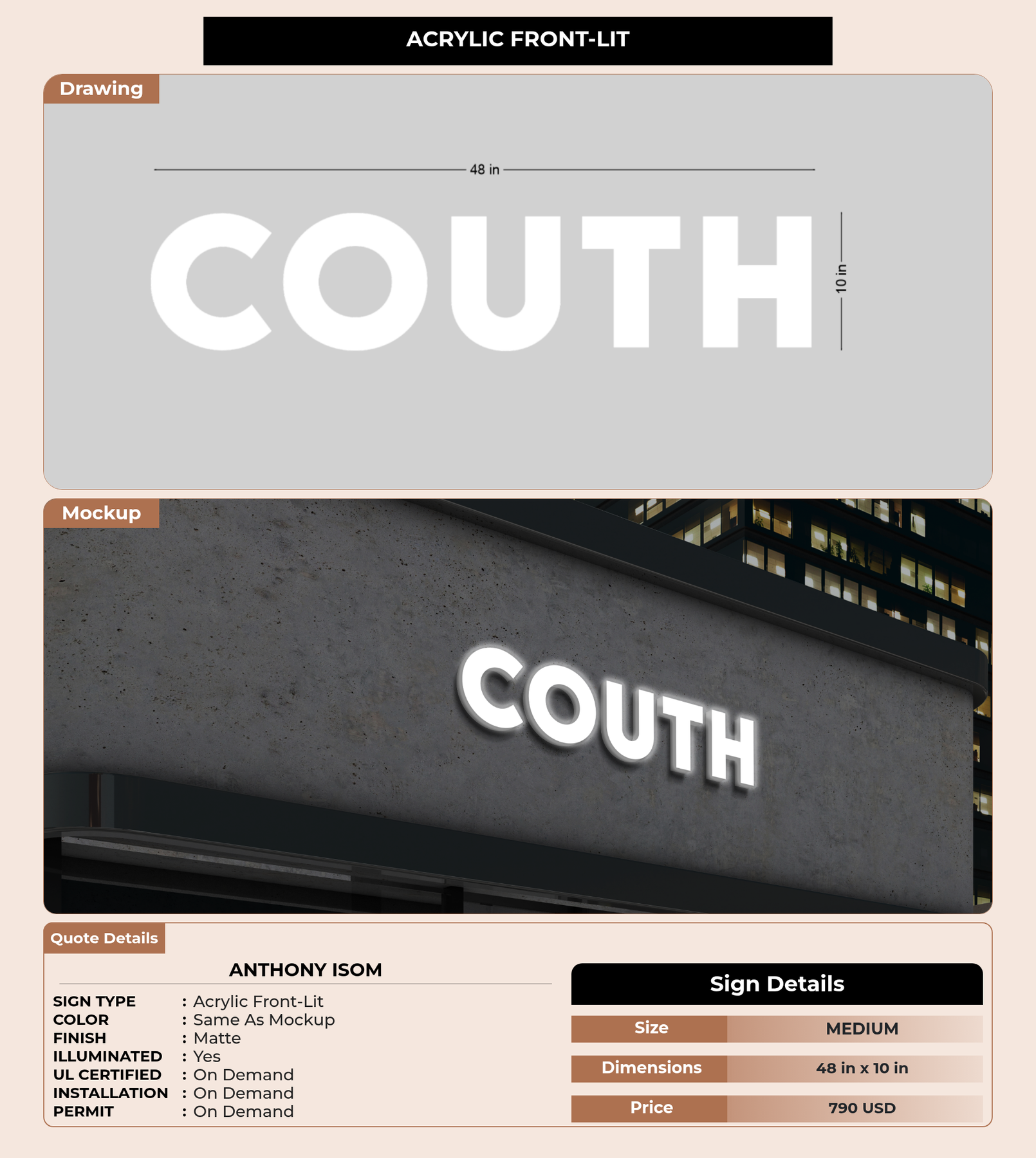 Enhance your business presence with our expertly crafted signage, made from top-quality material, to ensure longevity and durability. Fully customizable to reflect your unique brand identity, our signage offers a professional and polished appearance. Easy to install and low maintenance, it’s the perfect addition to any business setting. Trust us to deliver a product that not only meets but exceeds your expectations.