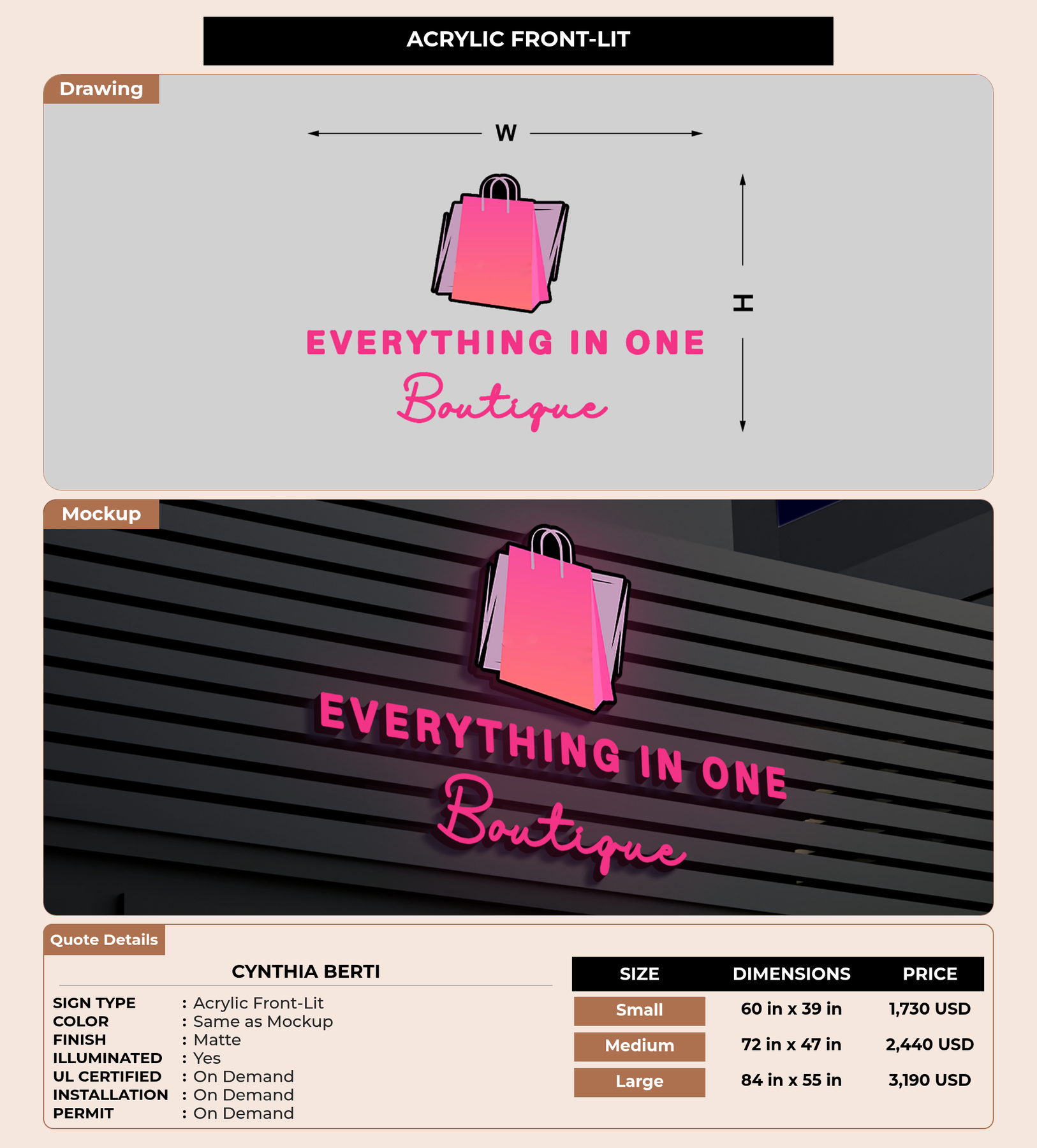 Enhance your business presence with our expertly crafted signage, made from top-quality material, to ensure longevity and durability. Fully customizable to reflect your unique brand identity, our signage offers a professional and polished appearance. Easy to install and low maintenance, it’s the perfect addition to any business setting. Trust us to deliver a product that not only meets but exceeds your expectations.