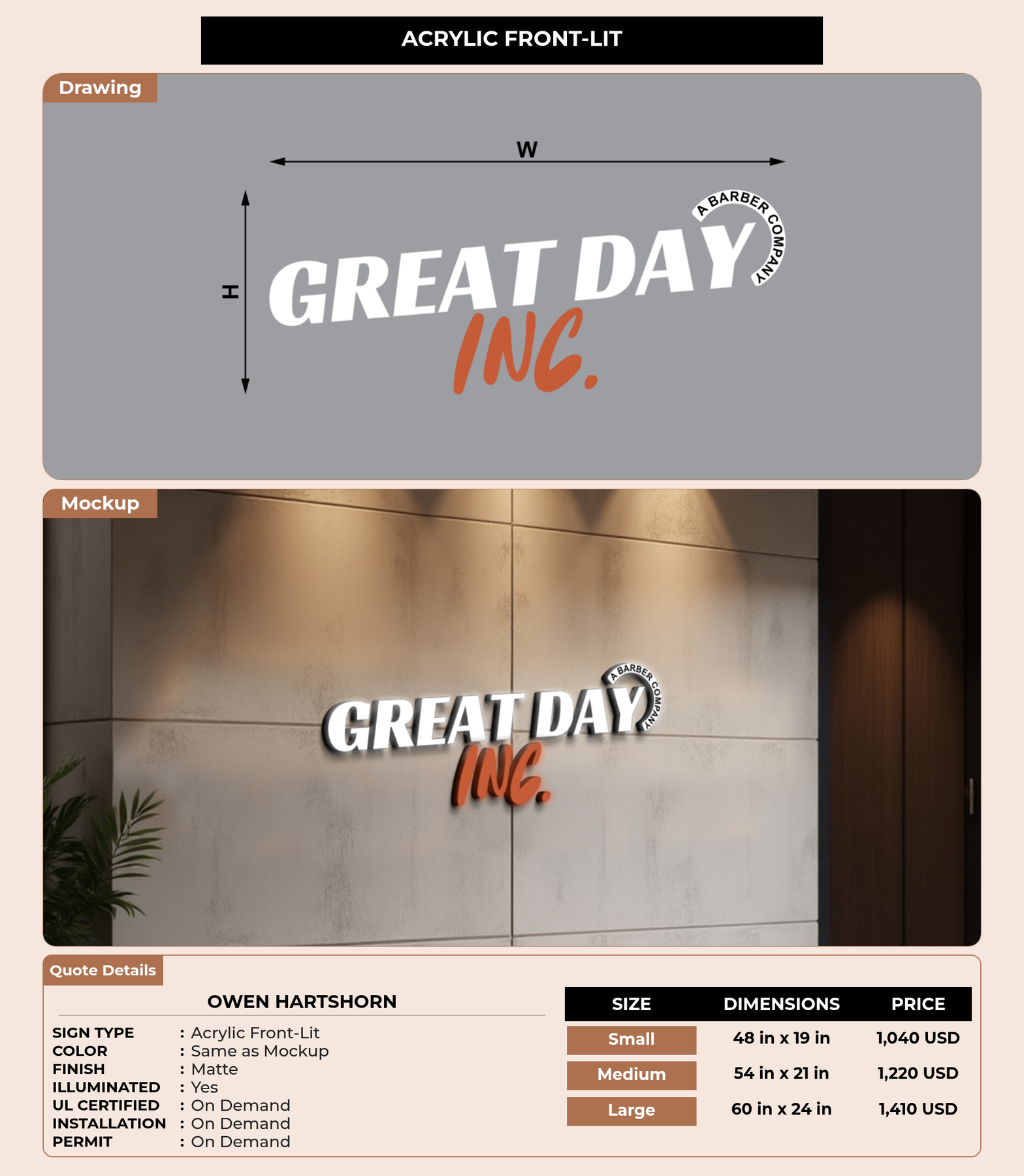 Enhance your business presence with our expertly crafted signage, made from top-quality material, to ensure longevity and durability. Fully customizable to reflect your unique brand identity, our signage offers a professional and polished appearance. Easy to install and low maintenance, it’s the perfect addition to any business setting. Trust us to deliver a product that not only meets but exceeds your expectations.