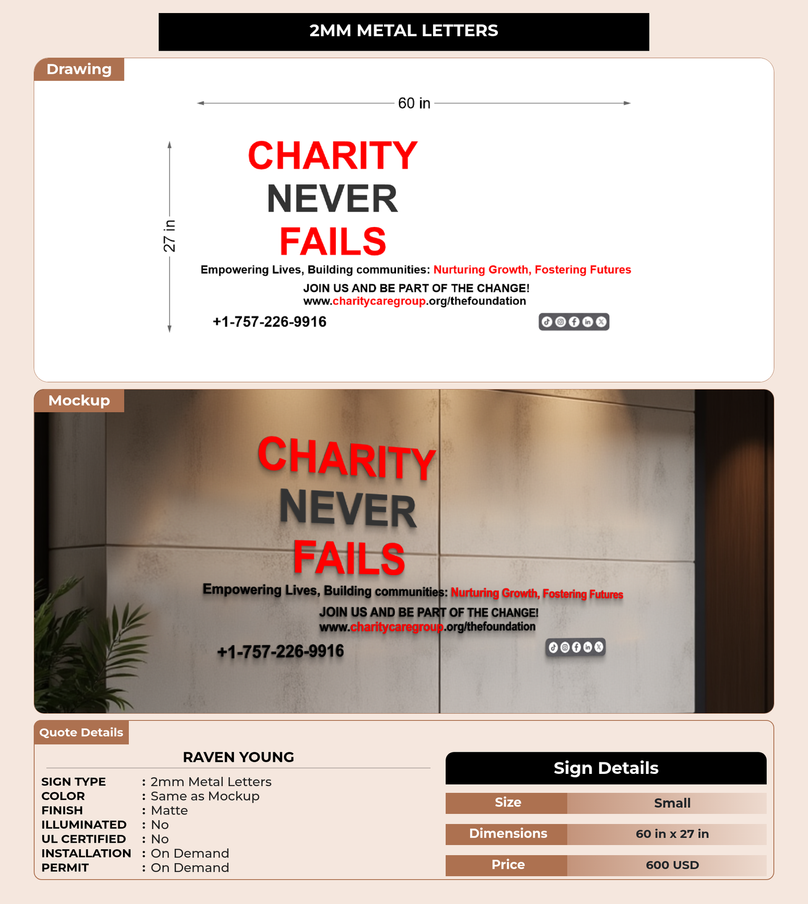 Enhance your business presence with our expertly crafted signage, made from top-quality material, to ensure longevity and durability. Fully customizable to reflect your unique brand identity, our signage offers a professional and polished appearance. Easy to install and low maintenance, it’s the perfect addition to any business setting. Trust us to deliver a product that not only meets but exceeds your expectations.