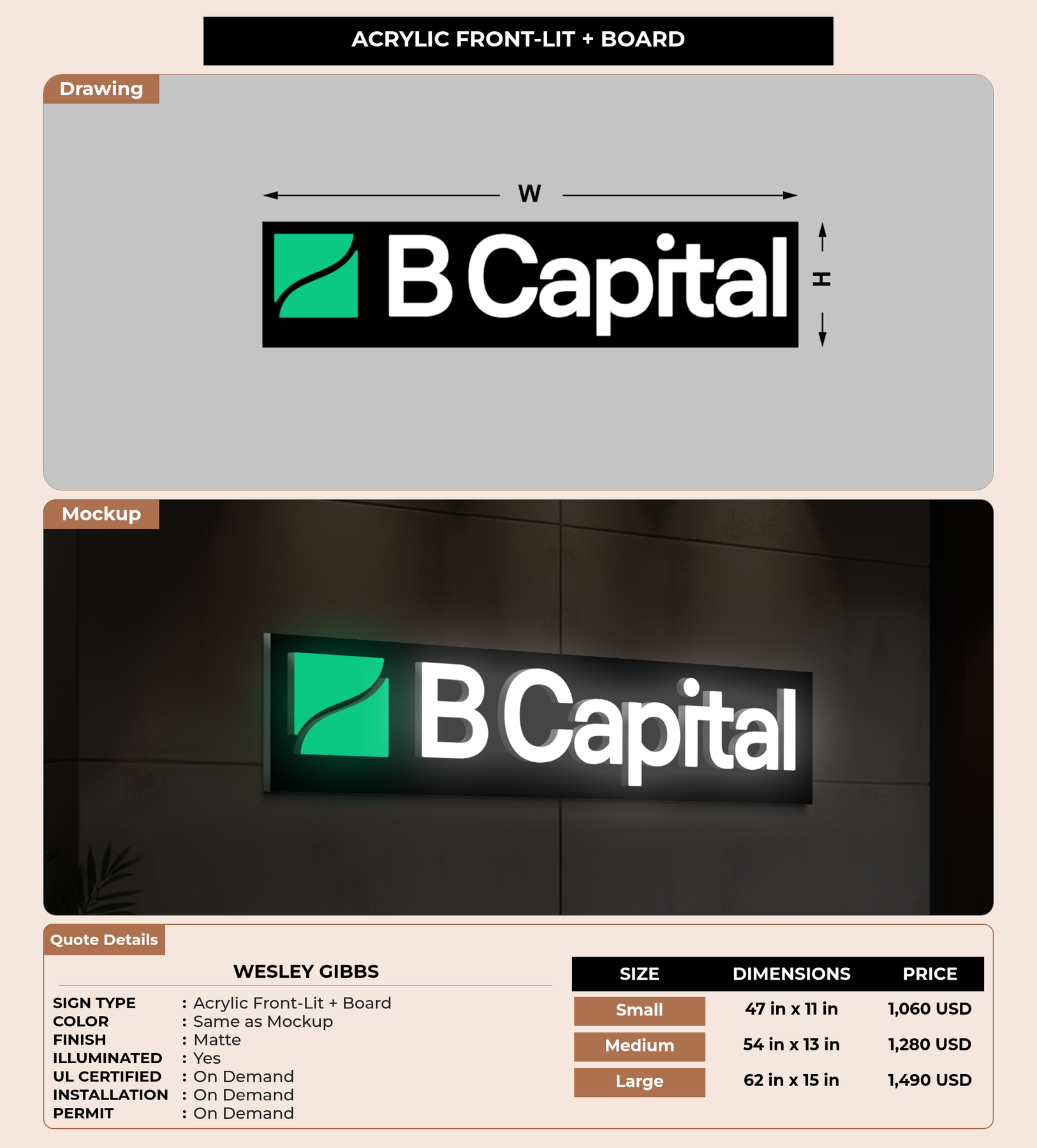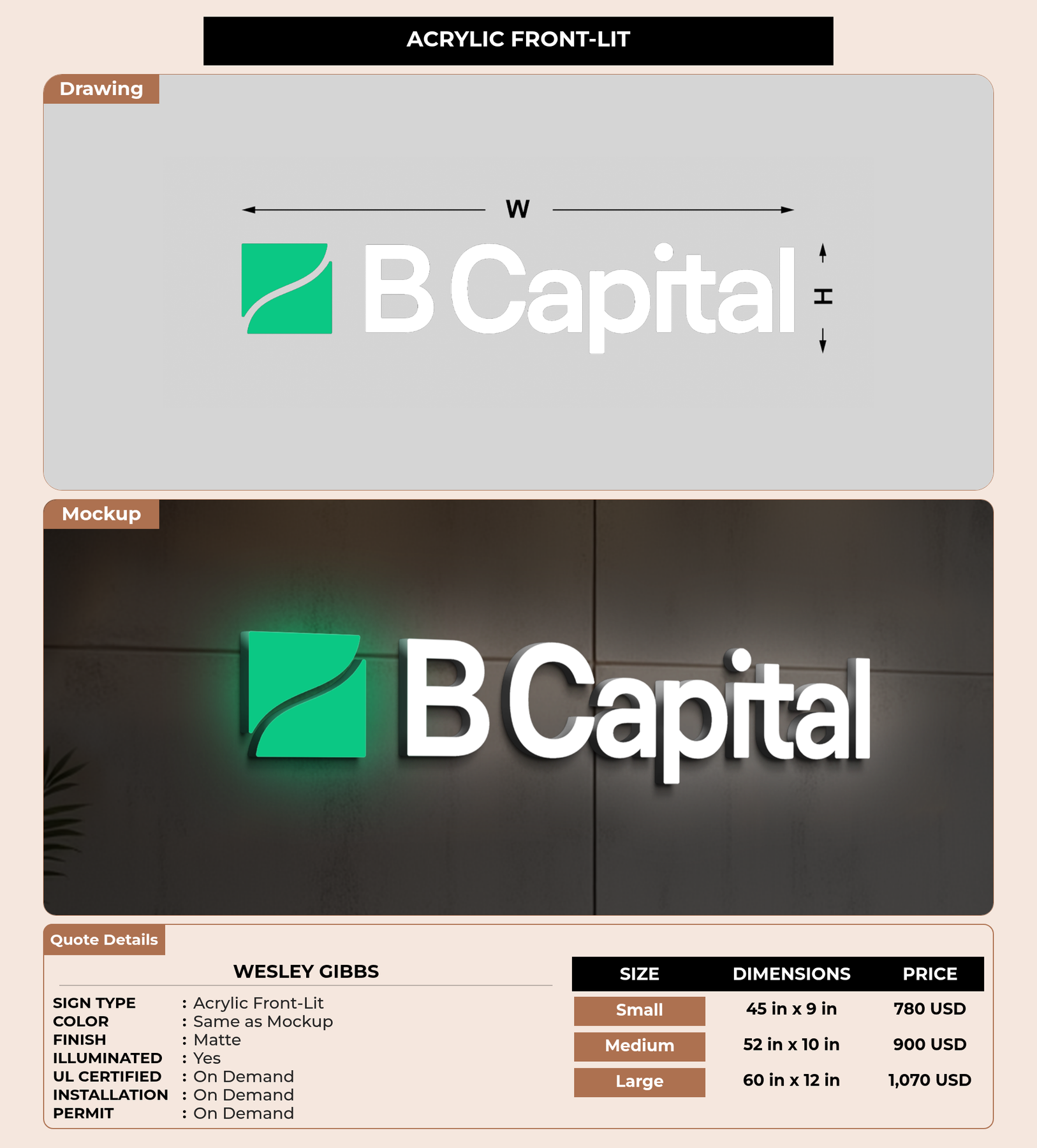 Enhance your business presence with our expertly crafted signage, made from top-quality material, to ensure longevity and durability. Fully customizable to reflect your unique brand identity, our signage offers a professional and polished appearance. Easy to install and low maintenance, it’s the perfect addition to any business setting. Trust us to deliver a product that not only meets but exceeds your expectations.