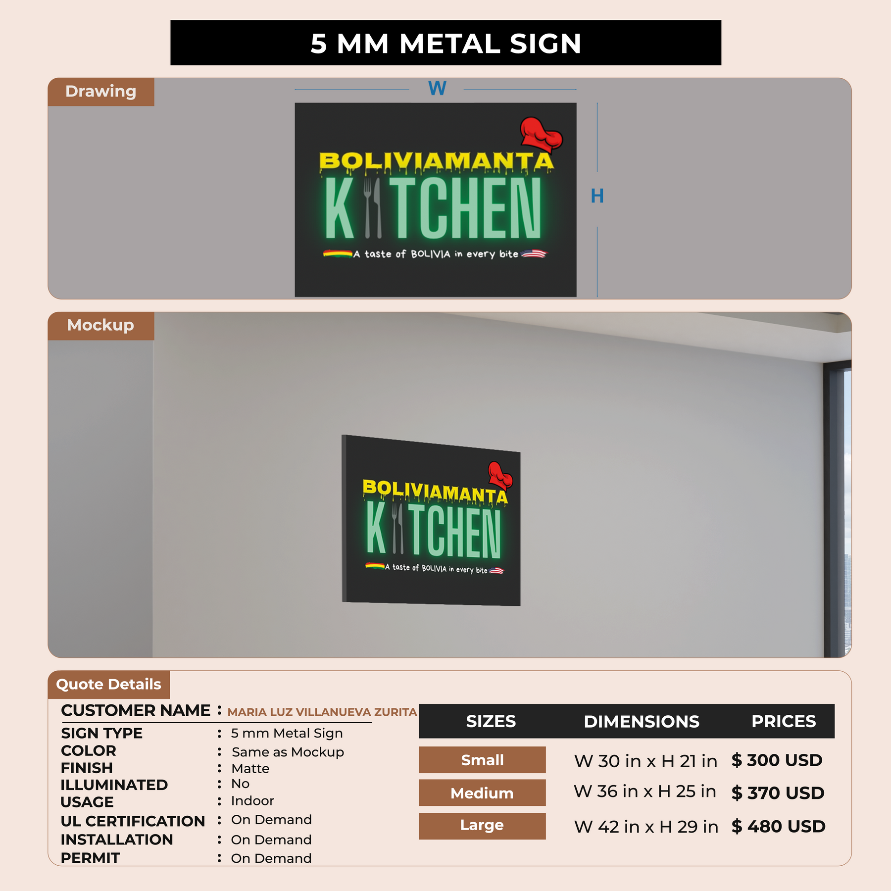 5mm metal sign for MARIA LUZ VILLANUEVA ZURITA