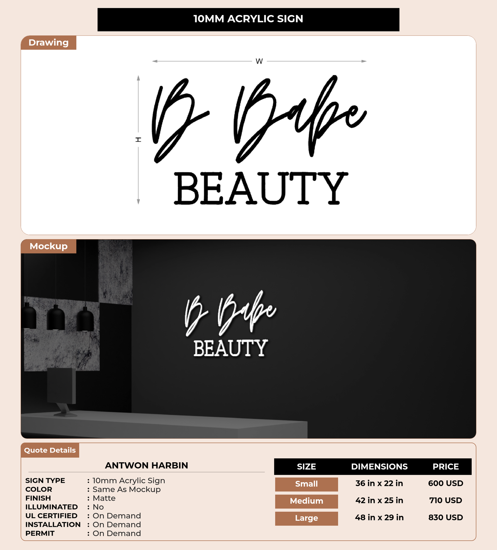 Enhance your business presence with our expertly crafted signage, made from top-quality material, to ensure longevity and durability. Fully customizable to reflect your unique brand identity, our signage offers a professional and polished appearance. Easy to install and low maintenance, it’s the perfect addition to any business setting. Trust us to deliver a product that not only meets but exceeds your expectations.