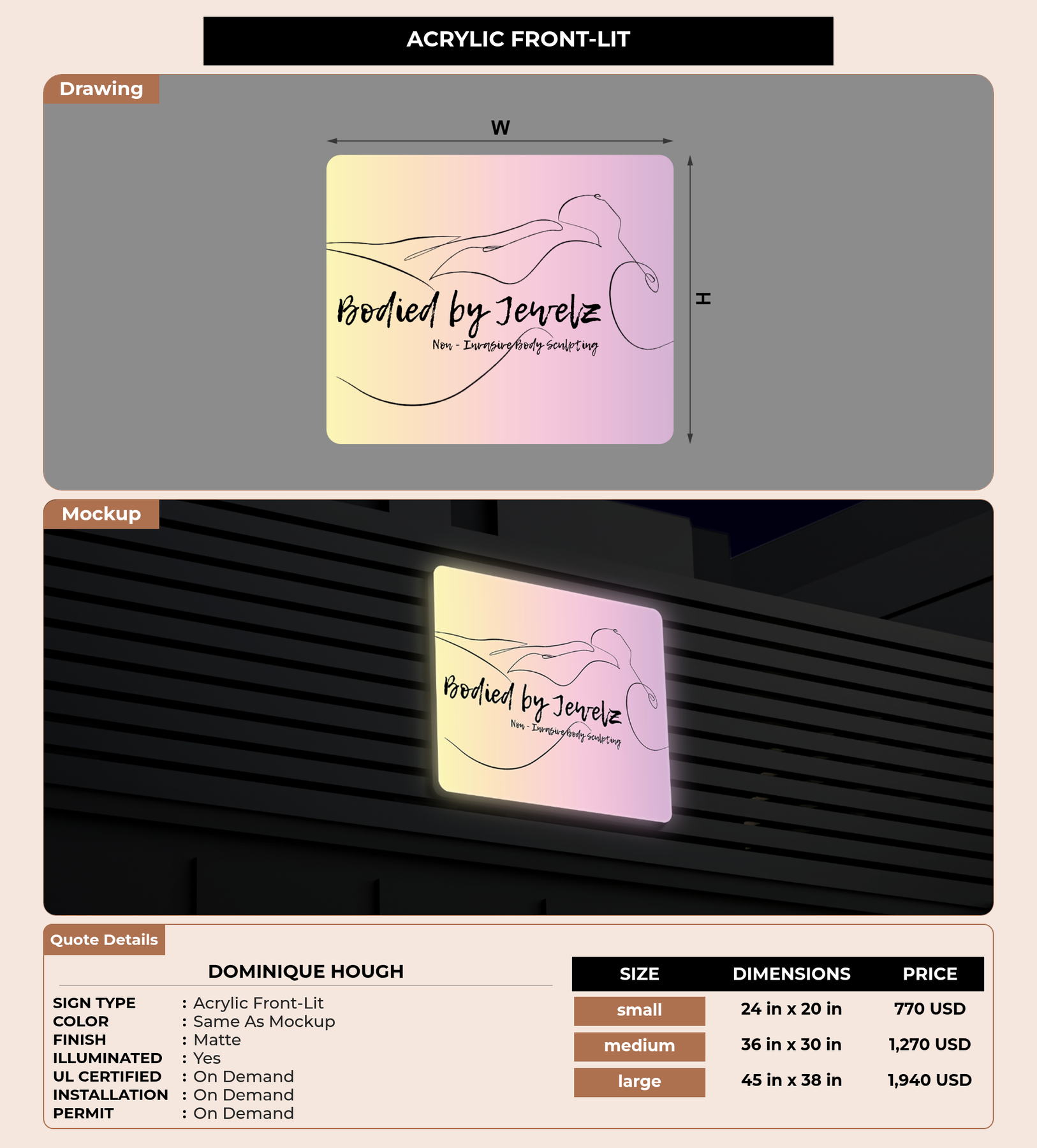 Enhance your business presence with our expertly crafted signage, made from top-quality material, to ensure longevity and durability. Fully customizable to reflect your unique brand identity, our signage offers a professional and polished appearance. Easy to install and low maintenance, it’s the perfect addition to any business setting. Trust us to deliver a product that not only meets but exceeds your expectations.
