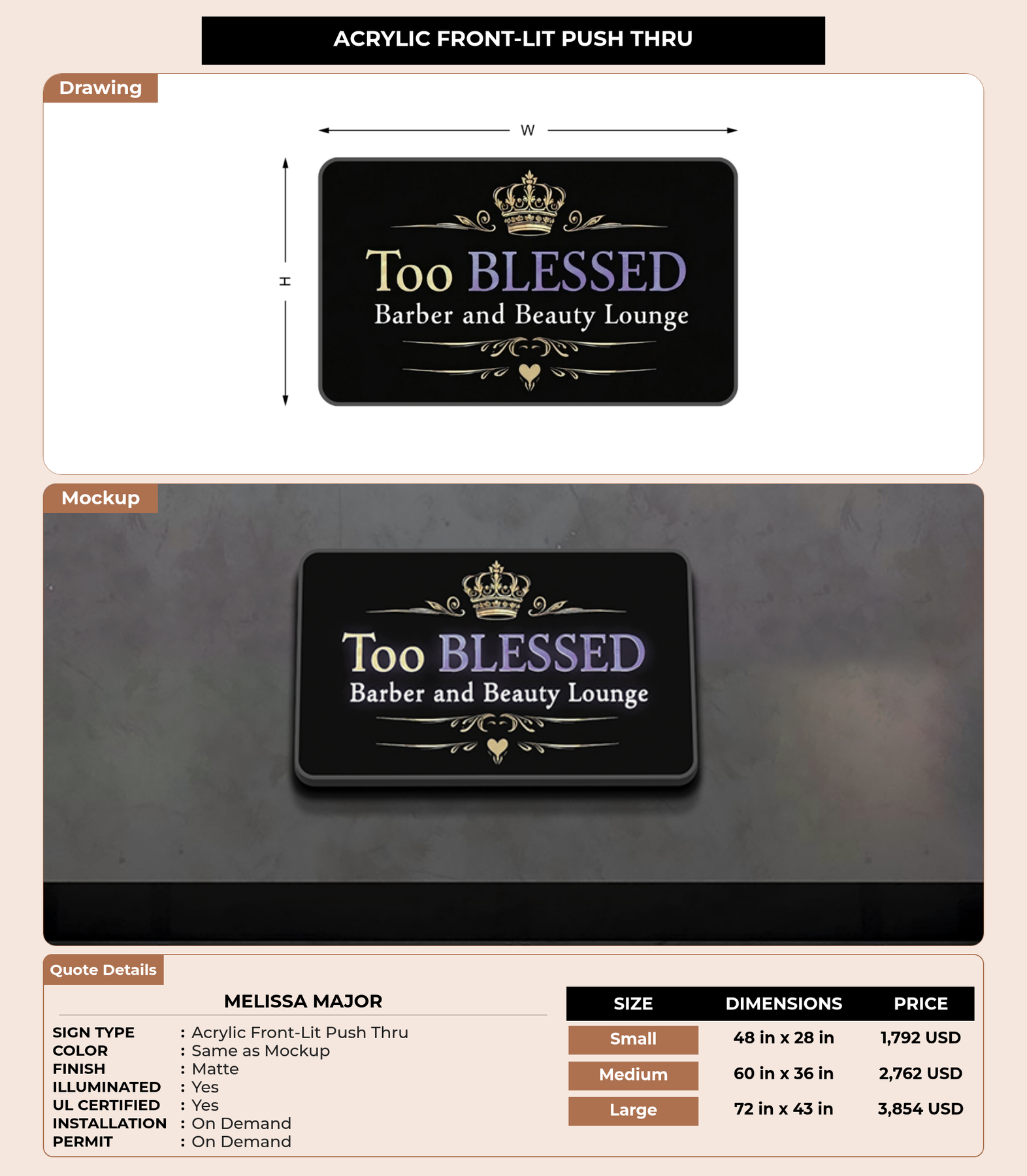 Enhance your business presence with our expertly crafted signage, made from top-quality material, to ensure longevity and durability. Fully customizable to reflect your unique brand identity, our signage offers a professional and polished appearance. Easy to install and low maintenance, it’s the perfect addition to any business setting. Trust us to deliver a product that not only meets but exceeds your expectations.