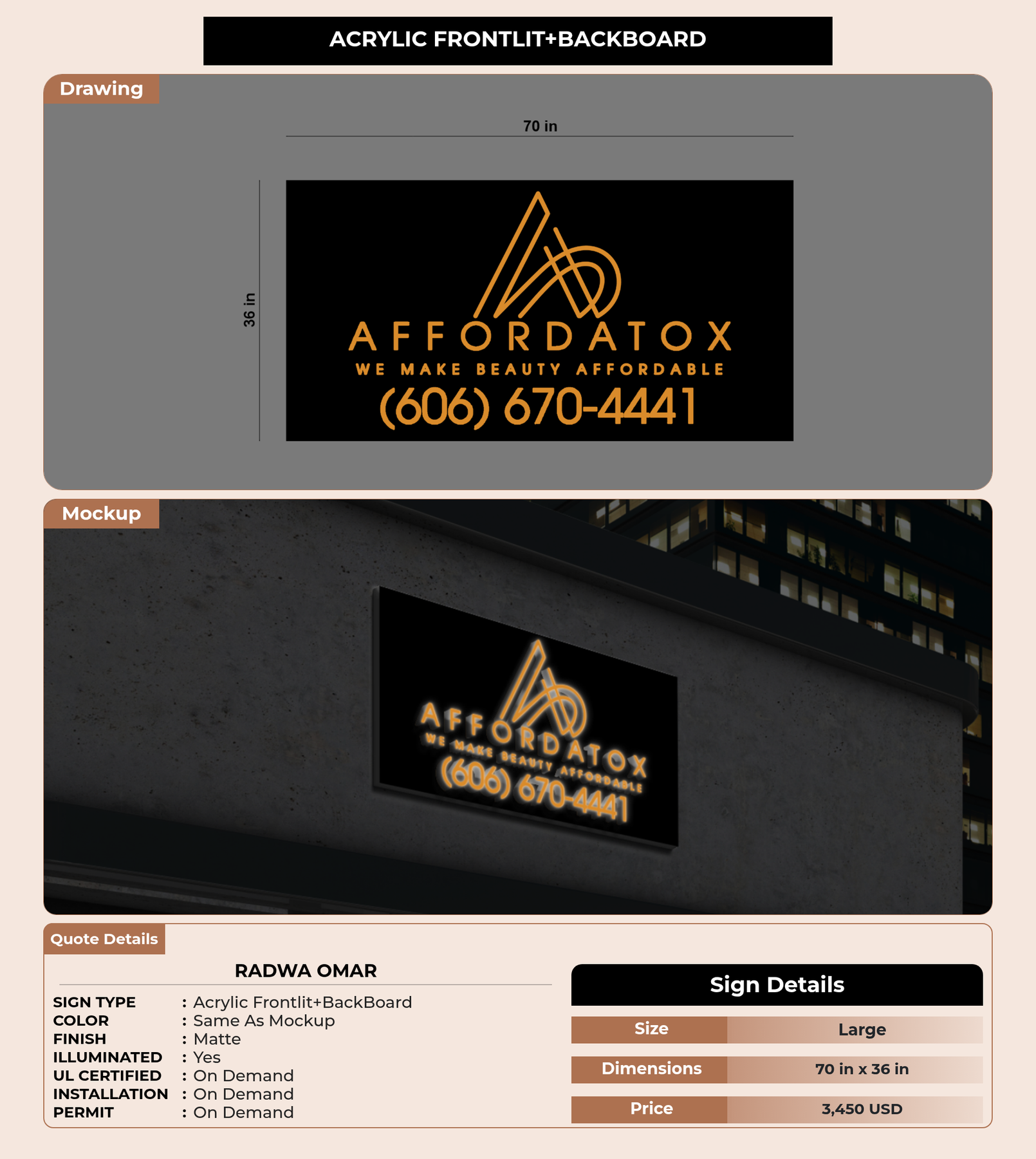 Enhance your business presence with our expertly crafted signage, made from top-quality material, to ensure longevity and durability. Fully customizable to reflect your unique brand identity, our signage offers a professional and polished appearance. Easy to install and low maintenance, it’s the perfect addition to any business setting. Trust us to deliver a product that not only meets but exceeds your expectations.