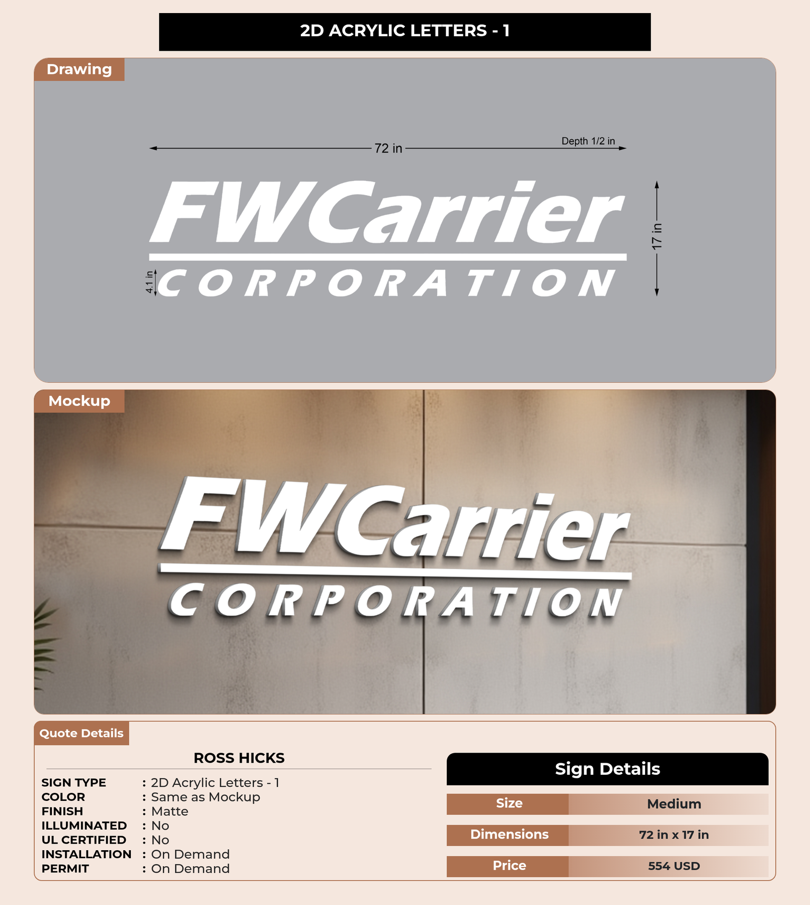 Enhance your business presence with our expertly crafted signage, made from top-quality material, to ensure longevity and durability. Fully customizable to reflect your unique brand identity, our signage offers a professional and polished appearance. Easy to install and low maintenance, it’s the perfect addition to any business setting. Trust us to deliver a product that not only meets but exceeds your expectations.
